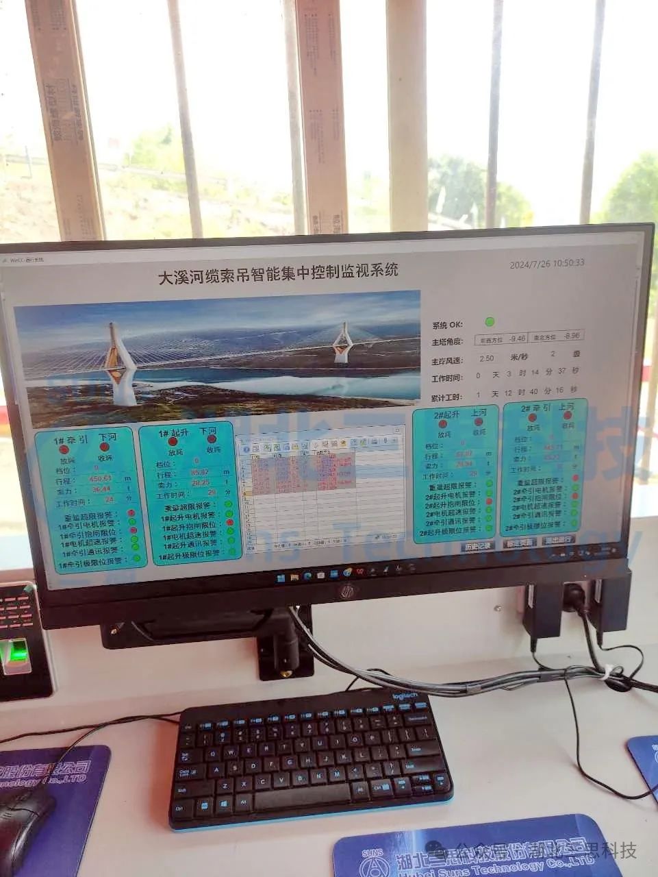 本次大溪河特大橋采用了由湖北三思科技自主研發(fā)的SSL-CB型纜索吊集中控制系統(tǒng),本系統(tǒng)是專門針對纜索吊此類特殊起重機開發(fā)的控制系統(tǒng),不僅包含了常規(guī)的特種設(shè)備監(jiān)控系統(tǒng)所需求的數(shù)據(jù)和視頻監(jiān)控之外,還特別添加了可將纜索吊卷揚機控制集中到一處控制的功能。集中控制不僅減少了人力成本,方便了操作員集中操作,更使纜索吊控制變得簡便、更安全,更提高了施工現(xiàn)場的吊裝效率,大大縮短了工程工期。