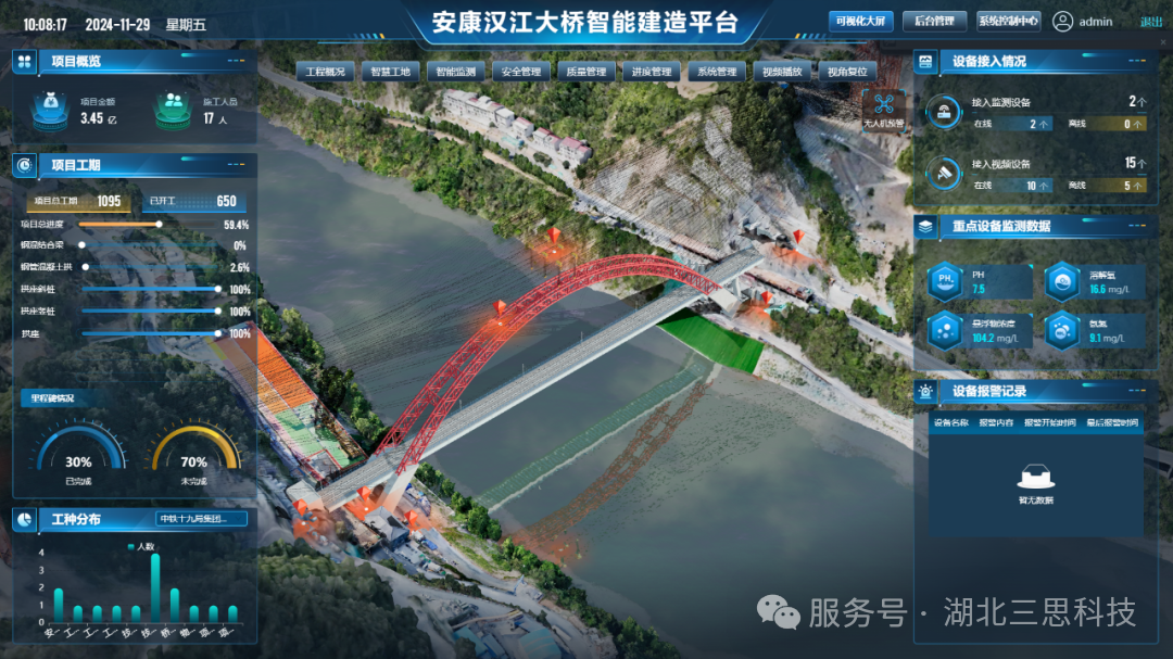平臺主要分為3D前端可視化、工程概況、智慧工地、智能監(jiān)測、安全管理、質(zhì)量管理、進(jìn)度管理等8個模塊,主要綜合了互聯(lián)網(wǎng)、三維建模、視頻監(jiān)控、BIM、智能化等現(xiàn)代技術(shù),融合了智慧工地可視化、橋梁3D建模,施工進(jìn)度可視化、工程管理、安全管理、質(zhì)量管理、進(jìn)度管理、數(shù)據(jù)分析、設(shè)備管理和告警等關(guān)鍵功能,建設(shè)數(shù)字化工程管控平臺,為安康漢江大橋的安全生產(chǎn)管理提供信息化支撐。通過可視化場景、數(shù)據(jù)管理、分析和合規(guī)性支持,幫助橋梁項(xiàng)目和設(shè)施管理者更高效地監(jiān)測、管理和維護(hù)基礎(chǔ)設(shè)施,降低成本、風(fēng)險和停機(jī)時間,推動項(xiàng)目成功交付和可持續(xù)性發(fā)展。