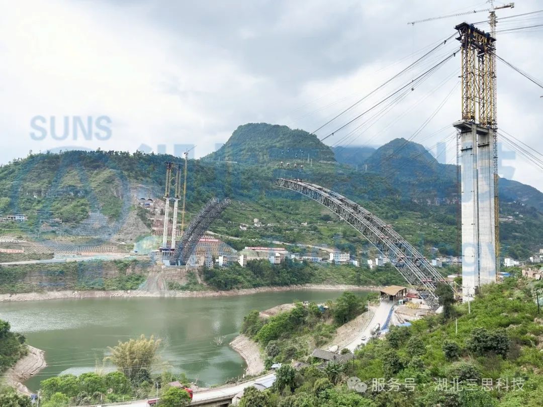 大河溝特大橋位于宜賓市屏山縣新市鎮(zhèn)境內(nèi),是一座跨徑為293.4米的鋼管混凝土中承式拱橋,主拱拱肋共64個節(jié)段,拱圈總計用鋼量約3300噸。大河溝特大橋為U型峽谷間的隧間橋,由于所處地勢陡峭險峻,施工建設(shè)面臨三大挑戰(zhàn)。一是拱座處于近90度垂直峭壁,機(jī)械設(shè)備無法開展作業(yè),前期進(jìn)場施工困難;二是大橋起吊高度距谷底高差約為230米,纜索吊裝系統(tǒng)施工困難;三是運(yùn)輸?shù)缆房v坡有6處大于16%,最大縱坡可達(dá)21%,運(yùn)輸構(gòu)件總高度達(dá)到8米,構(gòu)件運(yùn)輸?shù)缆防щy。為確保大河溝特大橋右線主拱順利實現(xiàn)合龍,項目建設(shè)團(tuán)隊全力推進(jìn)技術(shù)攻關(guān)工作。一是工藝新,運(yùn)用先栓后焊的工藝,實現(xiàn)了全橋臨時螺栓全連接,以工藝創(chuàng)新實現(xiàn)精準(zhǔn)對接。二是結(jié)構(gòu)新,采用“單側(cè)索塔+兩岸錨碇”形成獨塔雙跨吊裝系統(tǒng),創(chuàng)造性地依據(jù)地形特征量身定制施工方案。三是系統(tǒng)新,使用由湖北三思科技自主研發(fā)的智能纜索吊智能集中控制系統(tǒng),通過APP遠(yuǎn)程控制纜索吊實現(xiàn)拱肋一鍵吊裝到位,提高了吊裝系統(tǒng)的高效性。