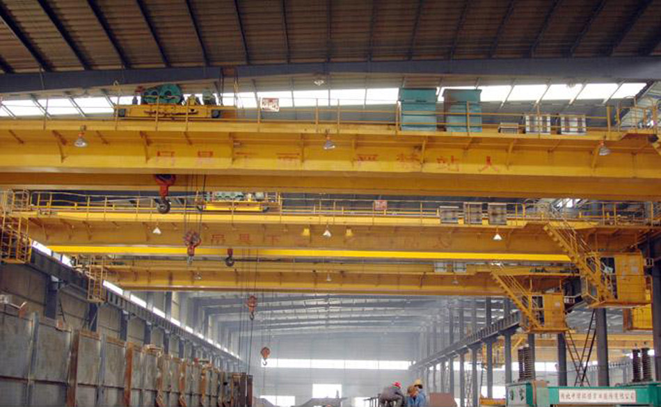 橋式起重機(jī)是橫架于車間、倉(cāng)庫(kù)和料場(chǎng)上空進(jìn)行物料吊運(yùn)的起重設(shè)備。由于它的兩端坐落在高大的水泥柱或者金屬支架上,形狀似橋。橋式起重機(jī)的橋架沿鋪設(shè)在兩側(cè)高架上的軌道縱向運(yùn)行,可以充分利用橋架下面的空間吊運(yùn)物料,不受地面設(shè)備的阻礙。它是使用范圍最廣、數(shù)量最多的一種起重機(jī)械。